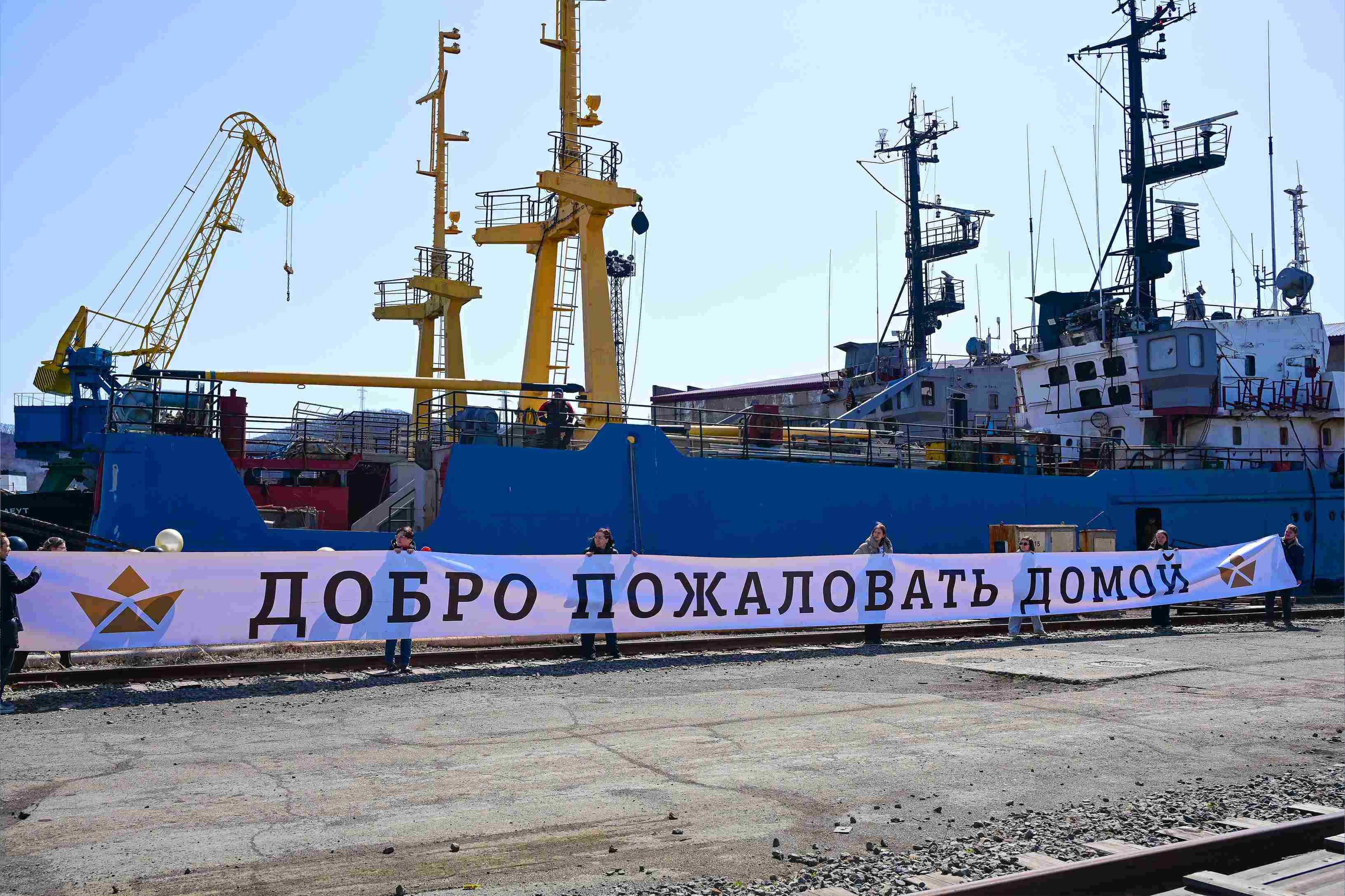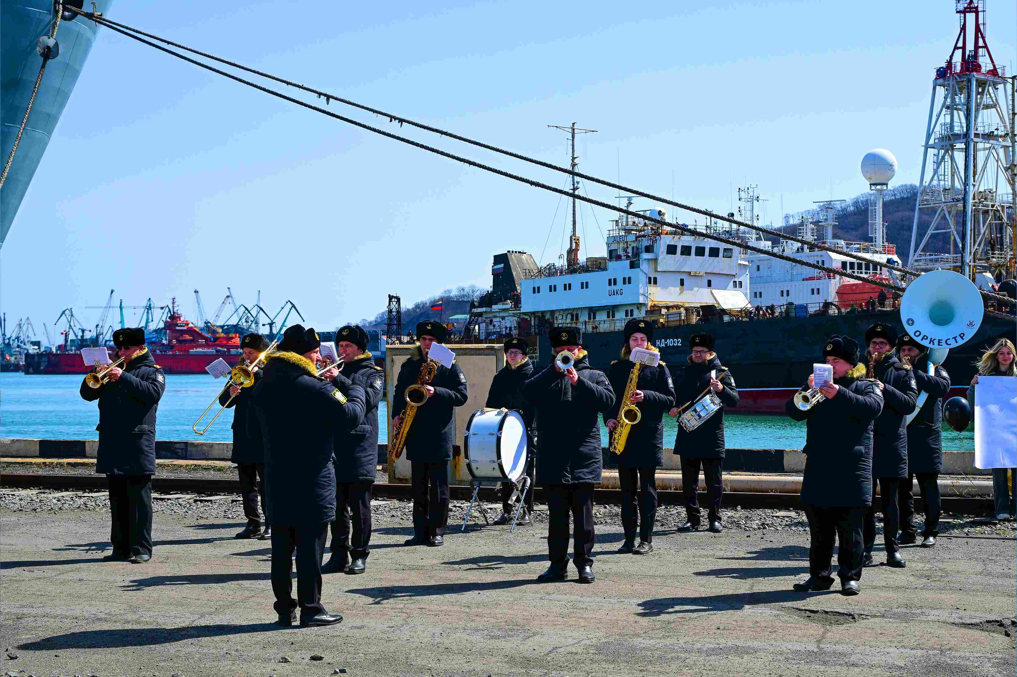 Прибытие судна прошло в торжественной обстановке. Экипаж приветствовали оркестр и группа встречающих с плакатами — в знак уважения и поддержки моряков, завершивших длительный рейс.